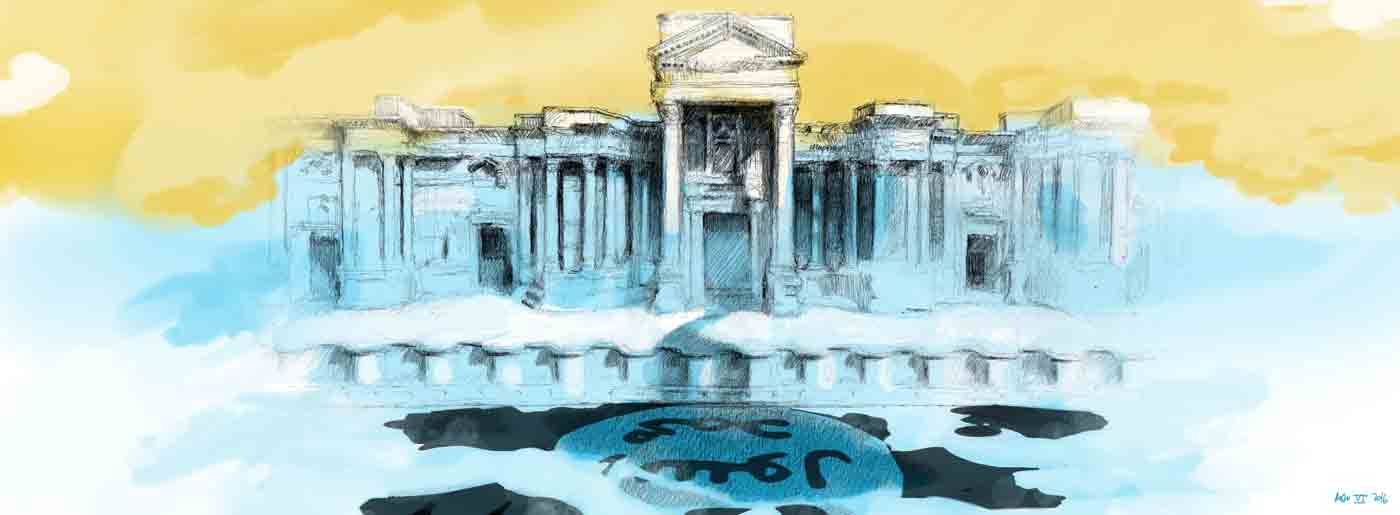I marmi rosati del tempio di Balshamin sono polvere ai piedi dell’unico portale rimasto intatto. Era uno dei monumenti più conosciuti del sito archeologico che nel 1980 fu designato patrimonio dell’Unesco. Il tempio è stato il primo a saltare in aria. Era dedicato a un dio fenicio, dio del cielo associato alla fertilità dei campi alle piogge. L’esplosione che lo ha distrutto è stata così violenta da danneggiare anche i colonnati intorno. Poi toccò all’arco di trionfo, poco distante, che ora allunga verso il cielo azzurro il suo moncone muto.